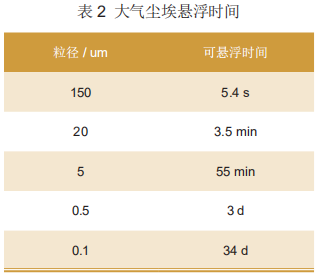 大氣塵埃中,粒徑小于1um的塵粒占總數(shù)量的99.9%,養(yǎng)殖畜禽易感病毒均依附于塵粒隨氣流傳播,重量大的塵粒會沉降,重量輕的長時(shí)間浮游于空氣中。大氣塵埃懸浮時(shí)間如表2所示。