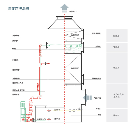 洗滌塔設(shè)備由塔體、篩板、噴淋管路、除霧層、循環(huán)水泵、循環(huán)水池、加藥系統(tǒng)等單元組成,廣泛應(yīng)用于工業(yè)廢氣除塵凈化,效果良好。
