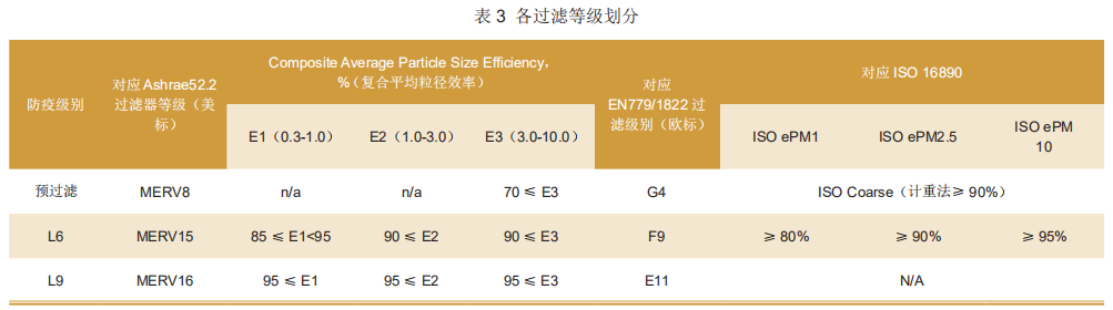 那么,到底該需要采用多大效率的過濾器,才可以將微粒病原濃度降低至致病濃度以下呢?基于明尼蘇達(dá)豬病根除中心ScottDee博士的實(shí)驗(yàn)研究結(jié)論,通過對過去十年來國外、國內(nèi)豬場過濾系統(tǒng)的調(diào)研統(tǒng)計(jì)結(jié)果亦證實(shí):大部分豬場采用L6過濾器(根據(jù)樣品實(shí)測為歐標(biāo)的F9,美標(biāo)為Merv15)作為主過濾器;在被認(rèn)為高風(fēng)險(xiǎn)的豬場,采用了更高級別的L9過濾器(根據(jù)樣品實(shí)測為歐標(biāo)E11,美標(biāo)為Merv16)為主過濾器;采用G4(Merv8)級別的初級過濾器作為主過濾器(Merv15/16)的保護(hù)過濾器(預(yù)過濾),來延長價(jià)格昂貴的主過濾器的使用壽命,可以有效保護(hù)豬舍免于遭受各種病毒的侵襲,各過濾等級劃分如表3所示。