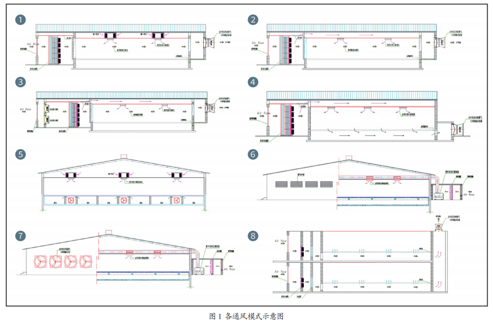 1)從送風(fēng)結(jié)構(gòu)上來劃分,大體分為水平通風(fēng)、垂直通風(fēng)、底部通風(fēng)的通風(fēng)模式;2)從空氣壓力結(jié)構(gòu)上來劃分,大體分為正壓、微正壓、負(fù)壓的通風(fēng)模式;3)從降溫特點(diǎn)上來劃分,大體分為濕膜降溫、空調(diào)降溫的通風(fēng)模式;4)從過濾的形式來劃分,大體分為全季節(jié)過濾、季節(jié)性分路通風(fēng)的通風(fēng)模式。