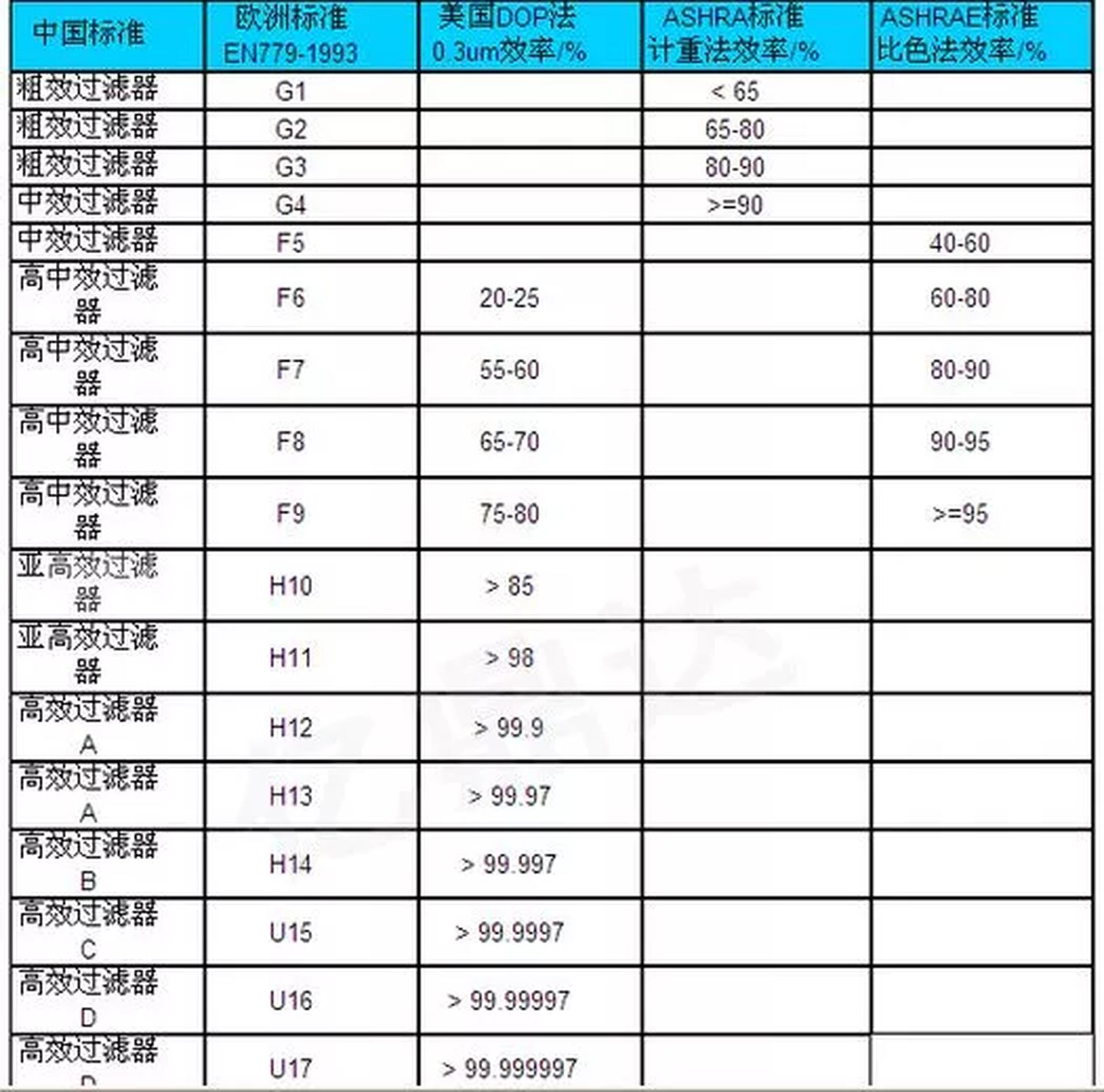 HEPA濾網等級劃分(如上圖):