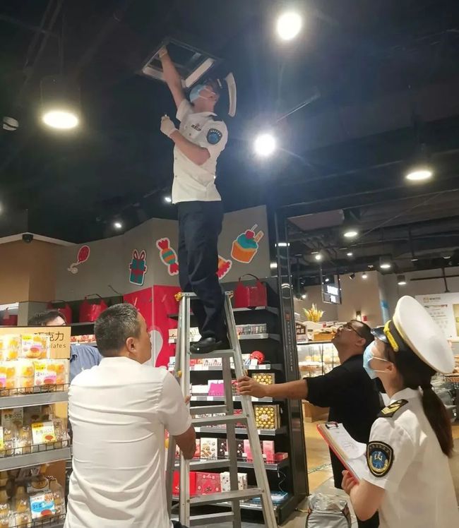 上海虹口,執(zhí)法人員對(duì)中央空調(diào)進(jìn)行例行檢查。