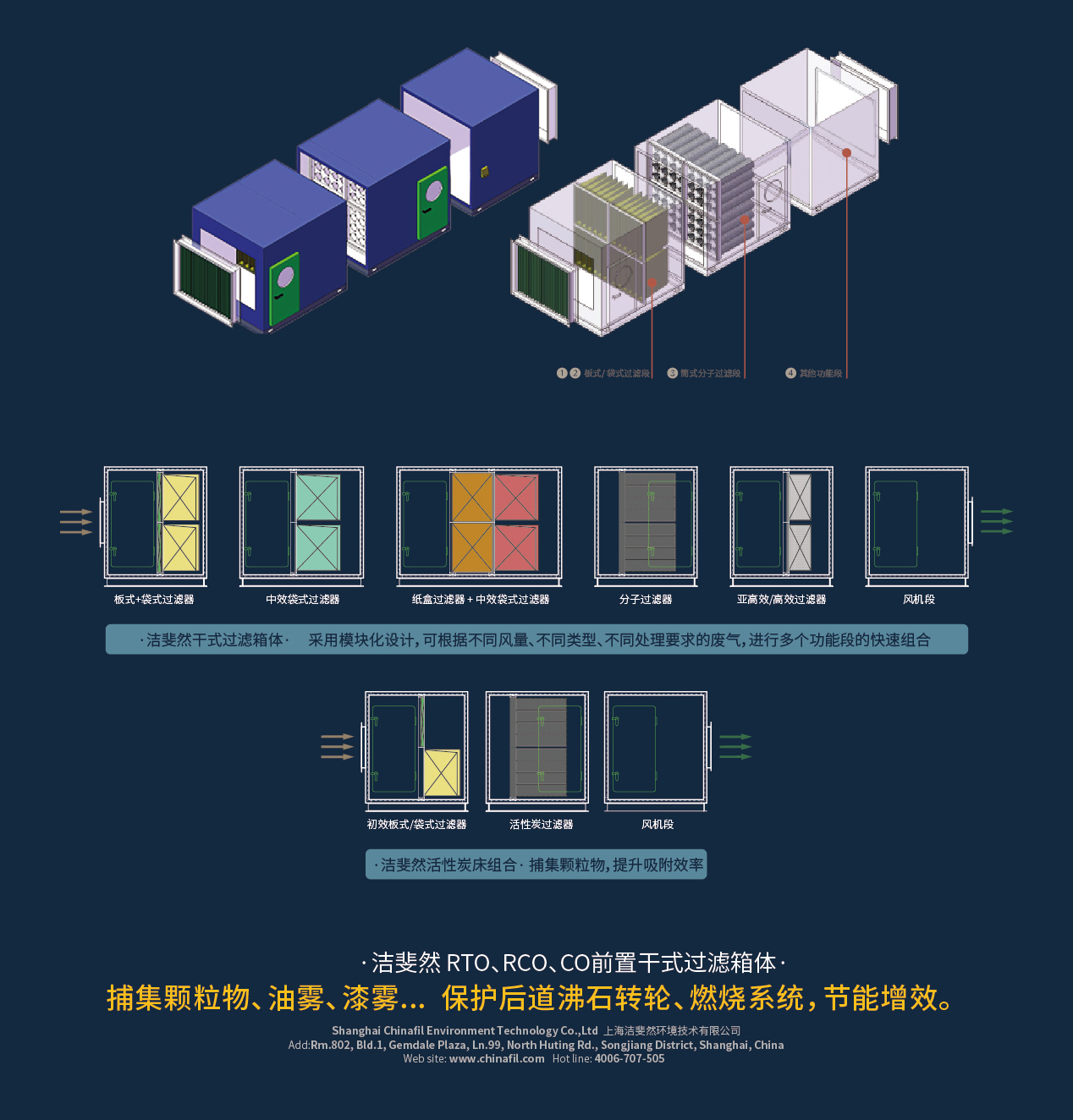 潔斐然干式過濾箱體適配一級或多級過濾器,對顆粒物、油霧、漆霧等物質進行攔截捕集,?,提高廢氣處理效率,?,為沸石轉輪、燃燒系統(tǒng)提供保護,減少轉輪、蓄熱燃燒設備 堵塞、結垢的風險。小小的投入,一“箱”兩悅,增效、節(jié)能、降本,延長RTO、RCO、CO設備使用壽命。