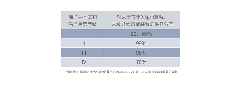 中華人民共和國國家標(biāo)準(zhǔn)《醫(yī)院潔凈手術(shù)部建筑技術(shù)規(guī)范GB50333-2013》中對(duì)醫(yī)院手術(shù)室、無菌病房、ICU、配置中心等場所都有相應(yīng)的潔凈要求,比如手術(shù)室和潔凈用房的送風(fēng)末級(jí)過濾器或裝置的效率分為左圖四個(gè)等級(jí)。